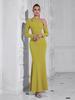 Această rochie de seară emană eleganță prin designul său sofisticat cu un umăr gol și silueta sa slim-fit.. Fabricat din poliester de înaltă calitate, oferă atât confort, cât și stil. Rochia prezintă o croială sexy fără spate, completată de mâneci lungi grațioase, făcând-o o alegere perfectă pentru ocazii formale.. Designul său rafinat asigură că vei face o impresie de durată la orice eveniment.