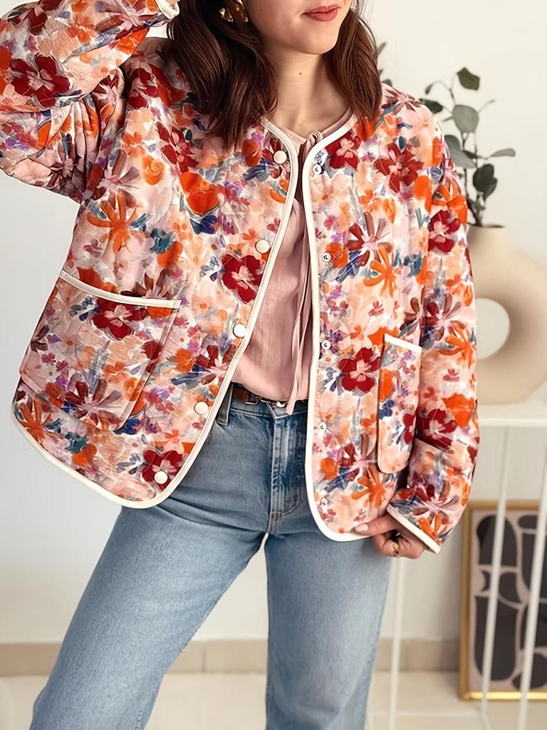 European and American Style Women's 2025 Retro Print Round Neck Single-Breasted Loose Casual Cotton Jacket with Pockets