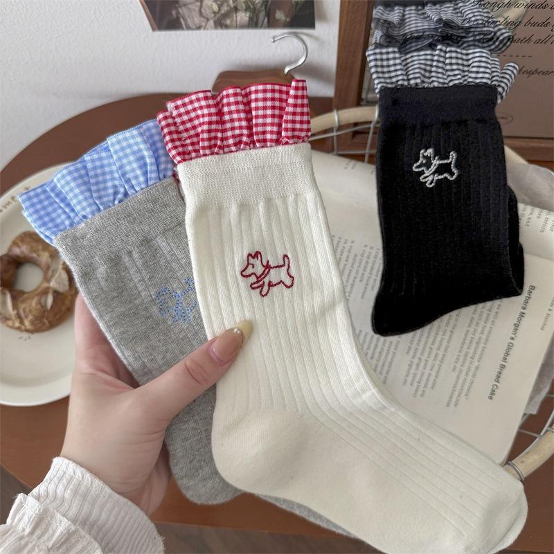 Checkered Puppy, White Socks, Girls' Lace, Cute Long Socks, Spring and Autumn Cartoon Academy Windbreaker Socks