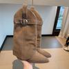 Frosted cowhide thick heel high heel pointed trousers boots women's 2025 new belt buckle long western boots.
