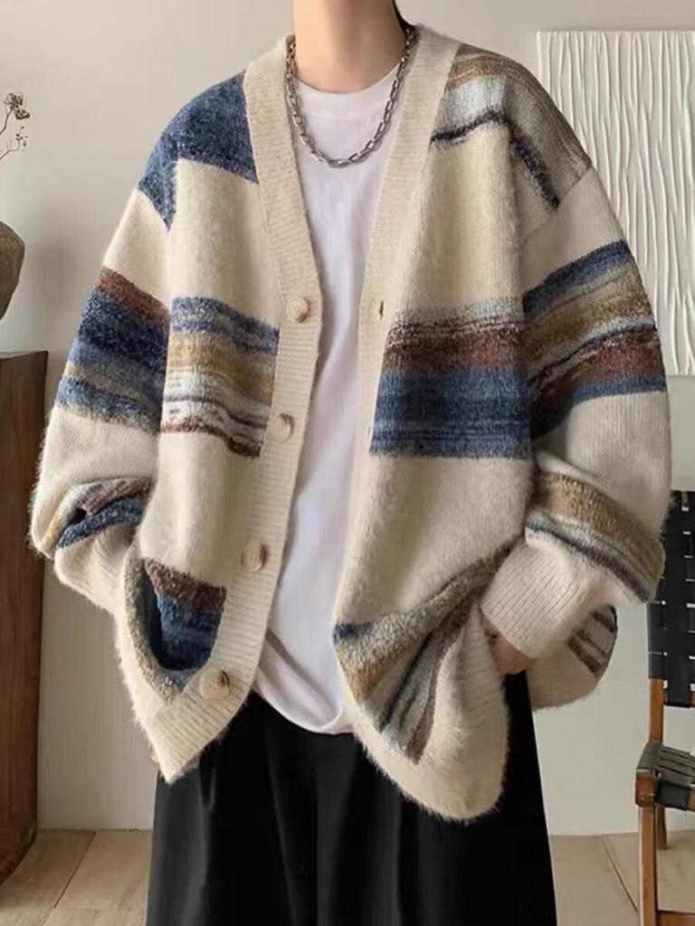 Cardigan Tricotat pentru Bărbați Retro cu Dungi și Blocuri de Culoare - Jachetă Tricotată de Toamnă/Iarnă pentru un Aspect Confortabil și Elegant
