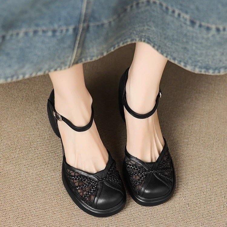 Baotou sandals women's summer thick-soled round head hollow high heels thick heel imitation leather soft sole small one-word buckle sandals