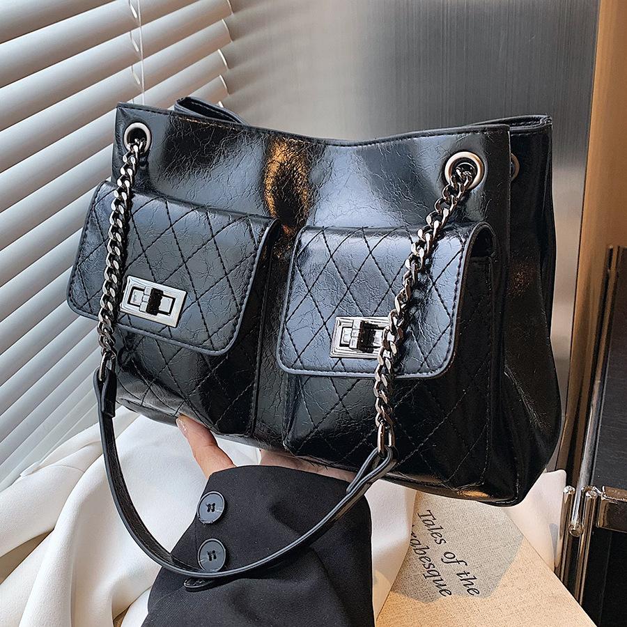 - **Structured Design Details**: Features a stylish hobo bag silhouette with PU material, glossy finish, quilted pocket details, and a metallic chain strap. It supports versatile carrying options (shoulder, crossbody) with an adjustable 100cm strap. It exudes retro and chic charm, perfect for adding a timeless touch to any outfit.