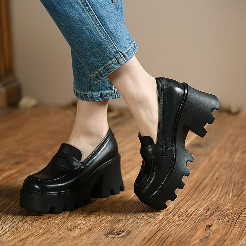 Fashion 2025 New Spring Genuine Leather Slip-On Platform Shoes Casual Loafers Round Toe Shoes Woman Flat Platform High Heel Women Shoes