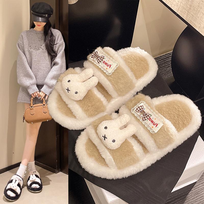 Design sense color matching cat fluffy slippers women's autumn and winter cute cartoon fashion outer wear home casual plush slippers