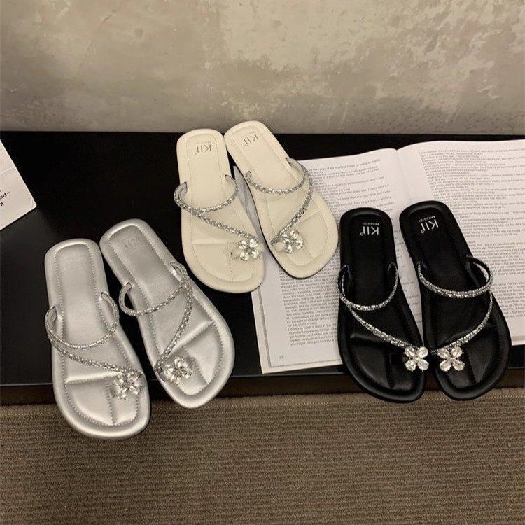 Flat-bottomed French set-toed small cool slippers fairy shoes 2025 new summer soft-soled with skirt rhinestone sandals