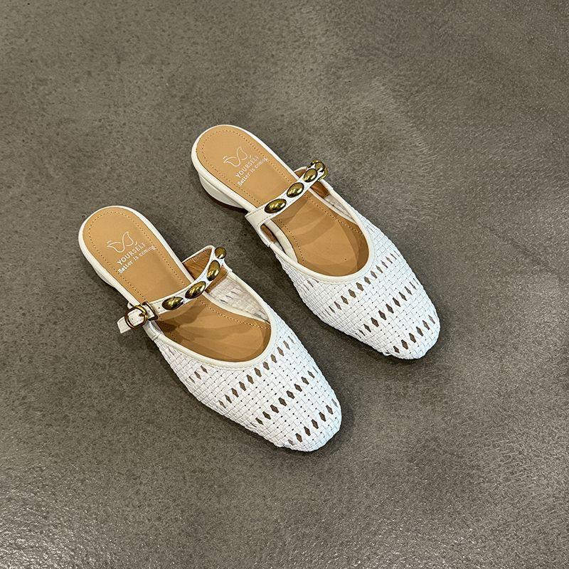French woven hollow bag head sandals women's summer new wear thick heel extraordinary foreign style one-word buckle casual slippers