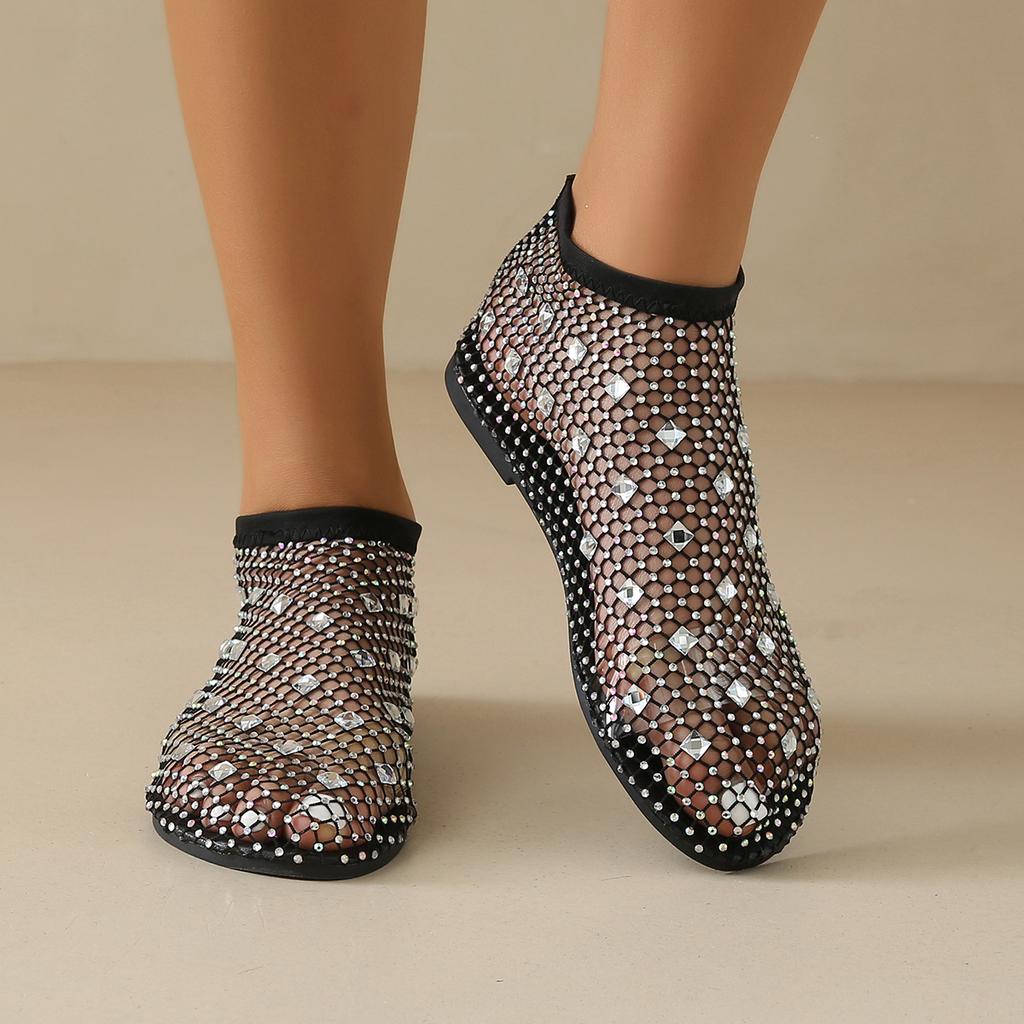 Fashion Low-cut Women's Flat Sandals Summer Mesh Hollow Breathable Outdoor Beach Fashion Rhinestone Decorative Baotou Sandals.