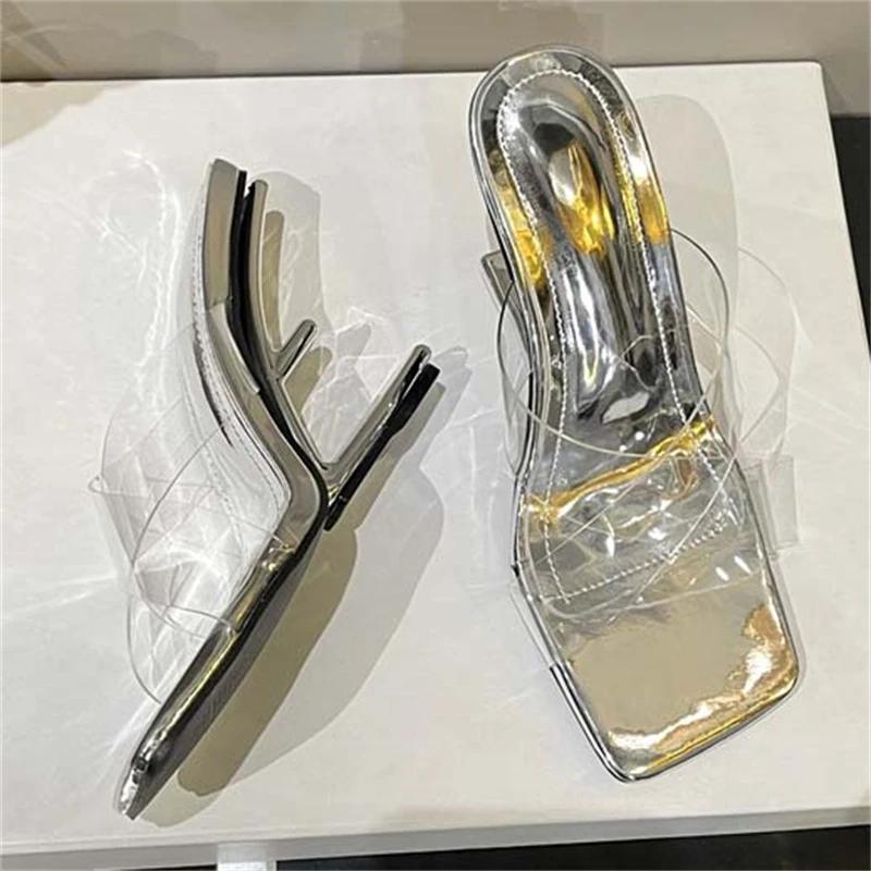 Eilyken PVC Transparent Women Sandals Design Style Fretwork High Heels Square Toe Shoes Summer Gold Silver Banquet Pumps