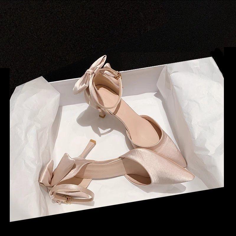 One-word buckle black high heels for women's new spring and summer stiletto bow niche design single shoes for women