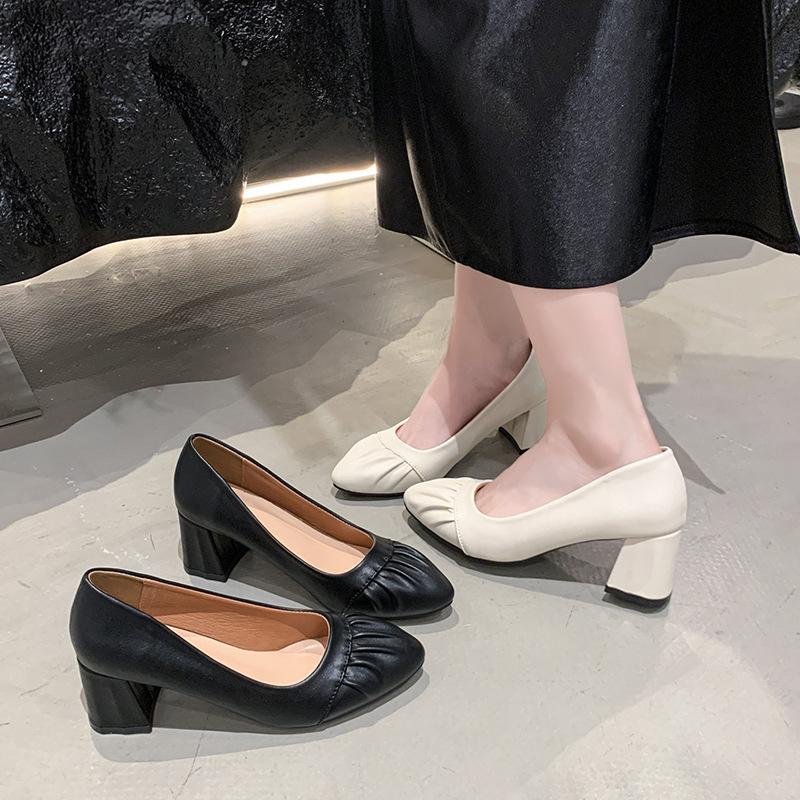 Large size pointed thick heel high heels women's spring and autumn new retro single shoes wrinkled light mouth middle heel women's shoes