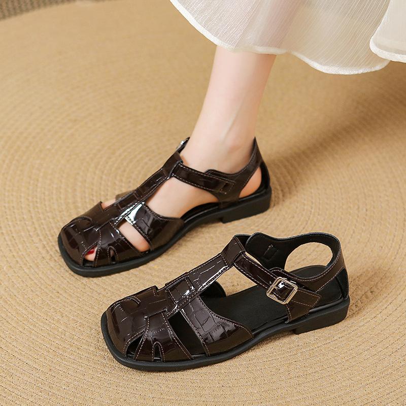 Square head hollow versatile casual pig cage shoes women's summer new retro baotou woven flat Roman sandals