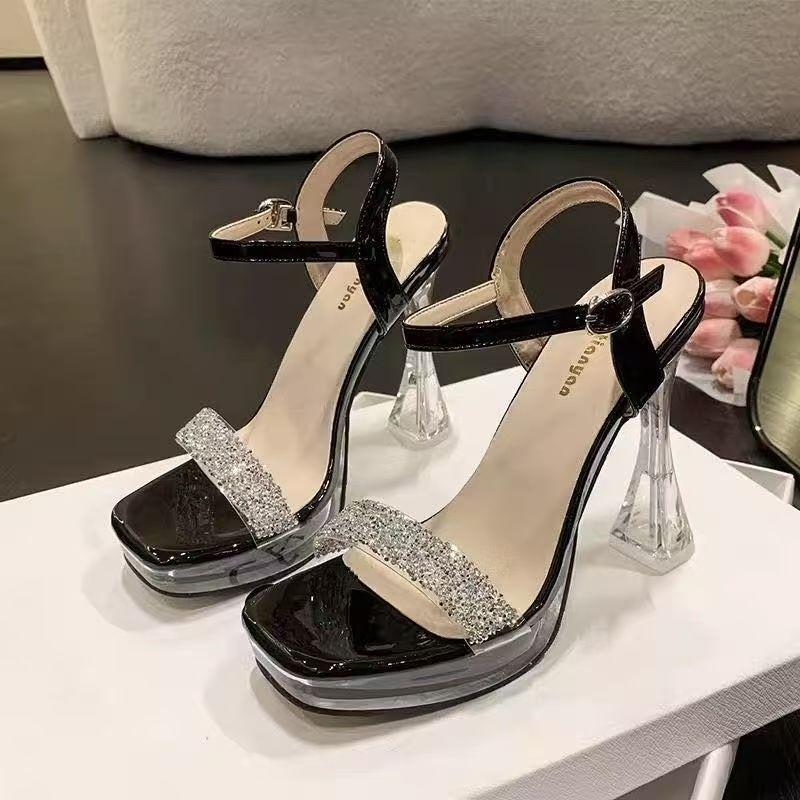 Transparent crystal heel open-toed high heels women's summer new rhinestone thick heel with waterproof table shoes