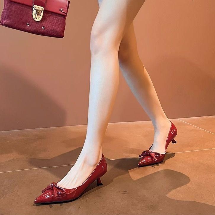 Not tired feet, high heels, medium heel, red bridal wedding shoes, French pointed toe, thin heel, single shoes, femininity bow.