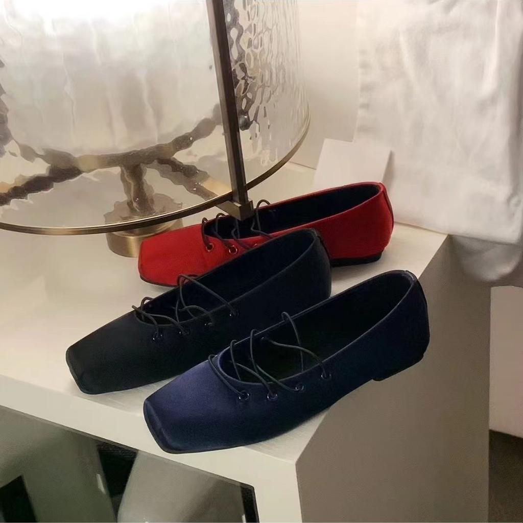 Korean new version of blue satin leather square head retro niche light mouth single shoes Mary Jane ballet flats women