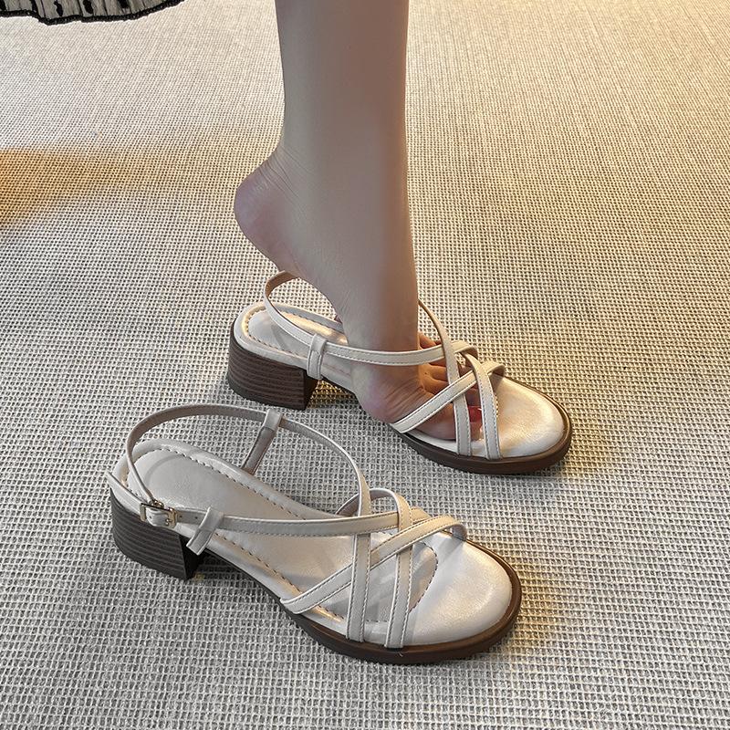 Spot~~ Stepping on shit thick heel thin strap Roman sandals women's summer new wear retro middle heel cross with slippers