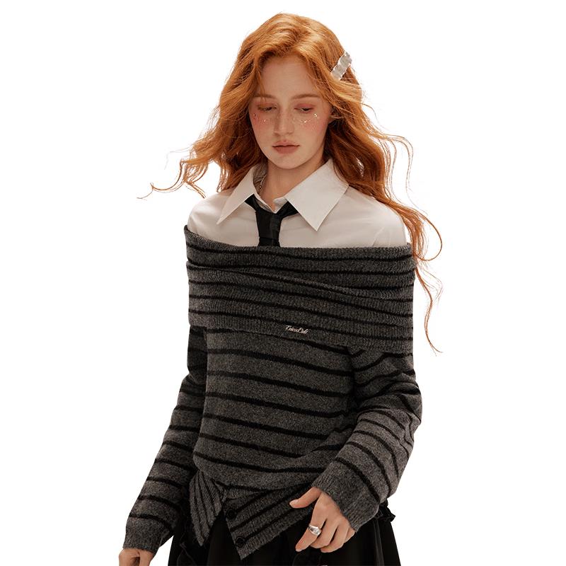 UNIFREE Women's French-Style Striped Off-Shoulder Knit Sweater