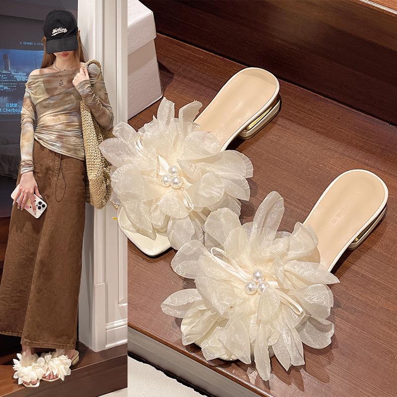 2025 summer new flower thick heel slippers women's outer wear square head open toe one-word drag middle heel sandals