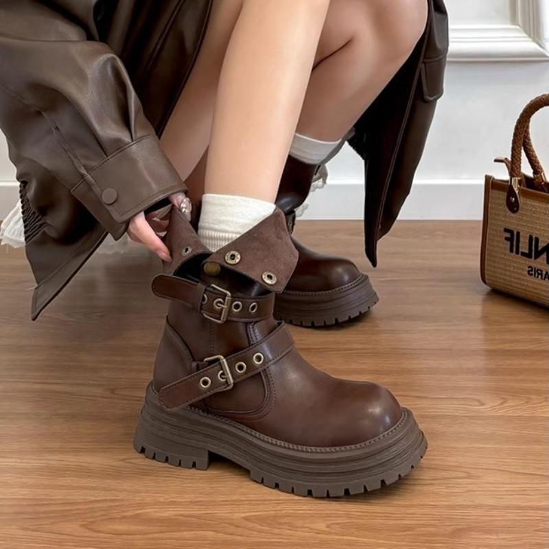 Fashion Women's Boots Fashion Retro Comfort Belt Fastener Lapel Women's Ankle Boots Chunky Platform PU Leather Knight Boots Botas Mujer