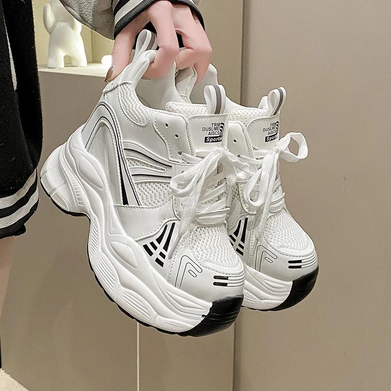 Fashion New Spring Women Breathable Mesh Chunky Sneakers 10CM High Platform Casual Shoes Lace-up Summer Sports Leather Shoes Woman 2024