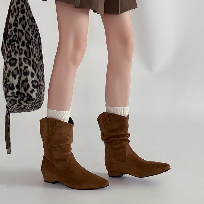 Fashion retro versatile pleated piled boots women's 2025 autumn and winter new matte leather pointed low heel western boots