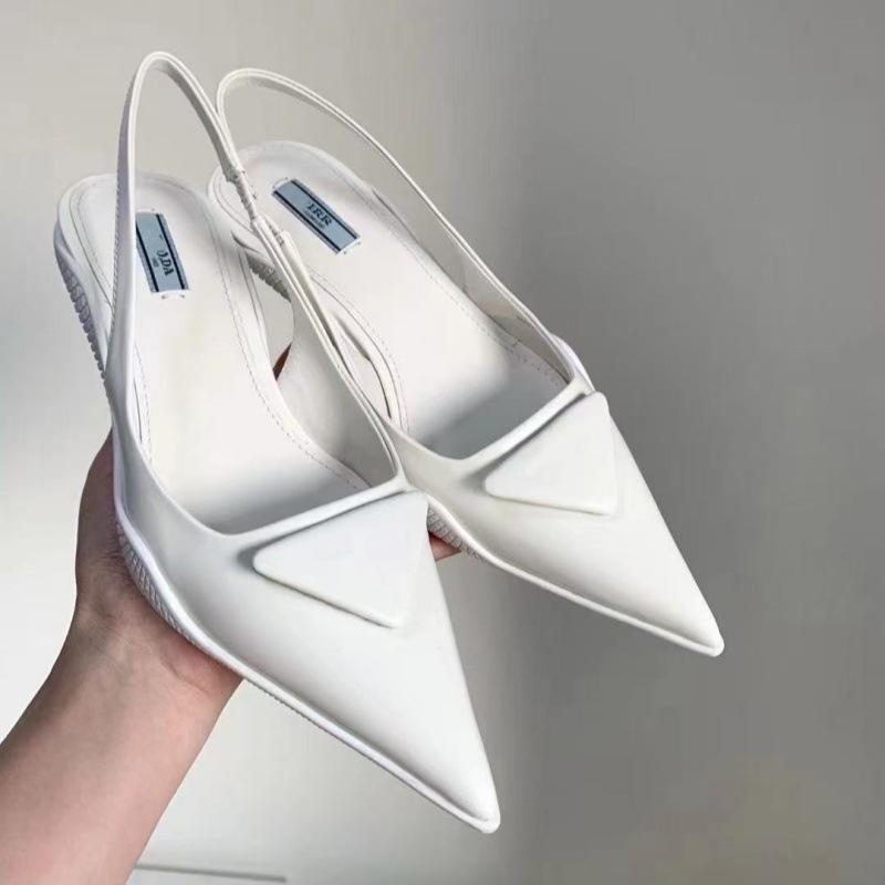 P casă etichetă triunghiulară pantofi cu toc înalt cu vârf femeie celebritate internet piele curea spate sandale toc pisoi cap sac gură superficială pantofi simpli versatili
