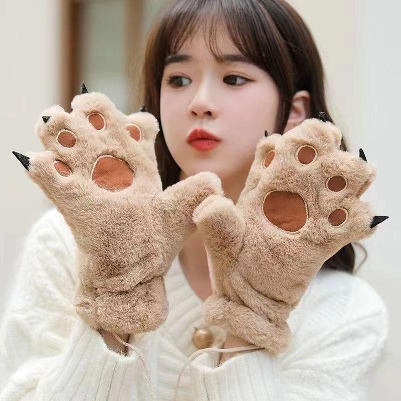 Cute Cat Paw Bear Paw Full Finger Gloves, Suitable For Both Men And Women, Thick And Plush Winter, Plush And Warm Outdoor Gloves