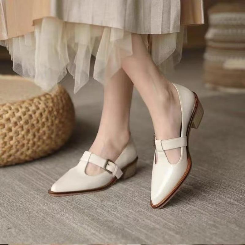Vintage Belt Buckle Pointed Single Shoes for Women 2025 Spring New Soft Leather British Small Shoes Thick Mid-heel