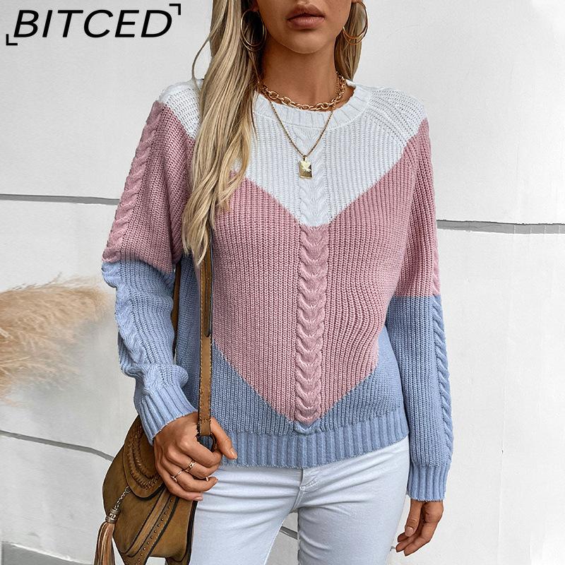 BITCED Colour-Blocked Cable-Knit Women's Sweater Autumn/Winter Vintage Oversized Pullover Knit Top