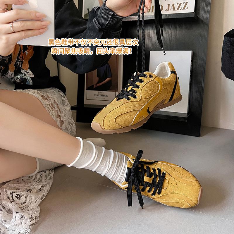 2025 autumn new cow velvet college wind moral training shoes soft waxy casual single shoes lace-up small yellow shoes confidential hair