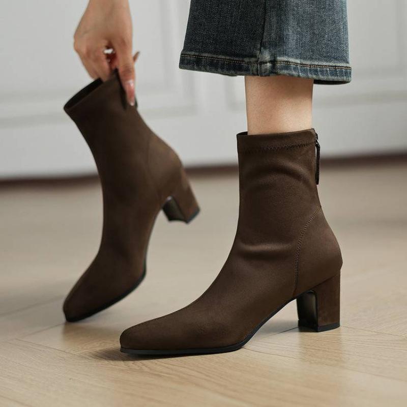 New elastic suede large size women's boots solid color high heel medium boots women's rear zipper beef tendon soft bottom Korean version fashion boots