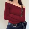 Off Shoulder Sexy Navy Blue Long Sleeve Tee Women Early Autumn Brightening Ruffle Waist Base Layer Top