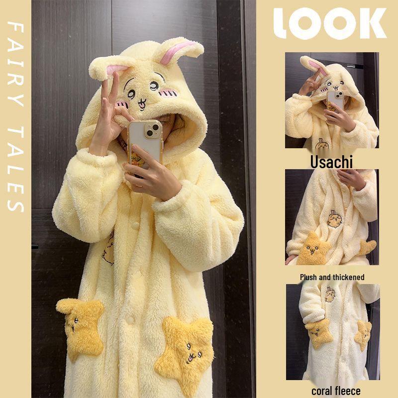 Set Pijama și Halat de Baie din Fleece Coral pentru Femei Usagi - Articole de Casă Drăguțe din Flanel cu Desene Animate pentru Toamnă și Iarnă.