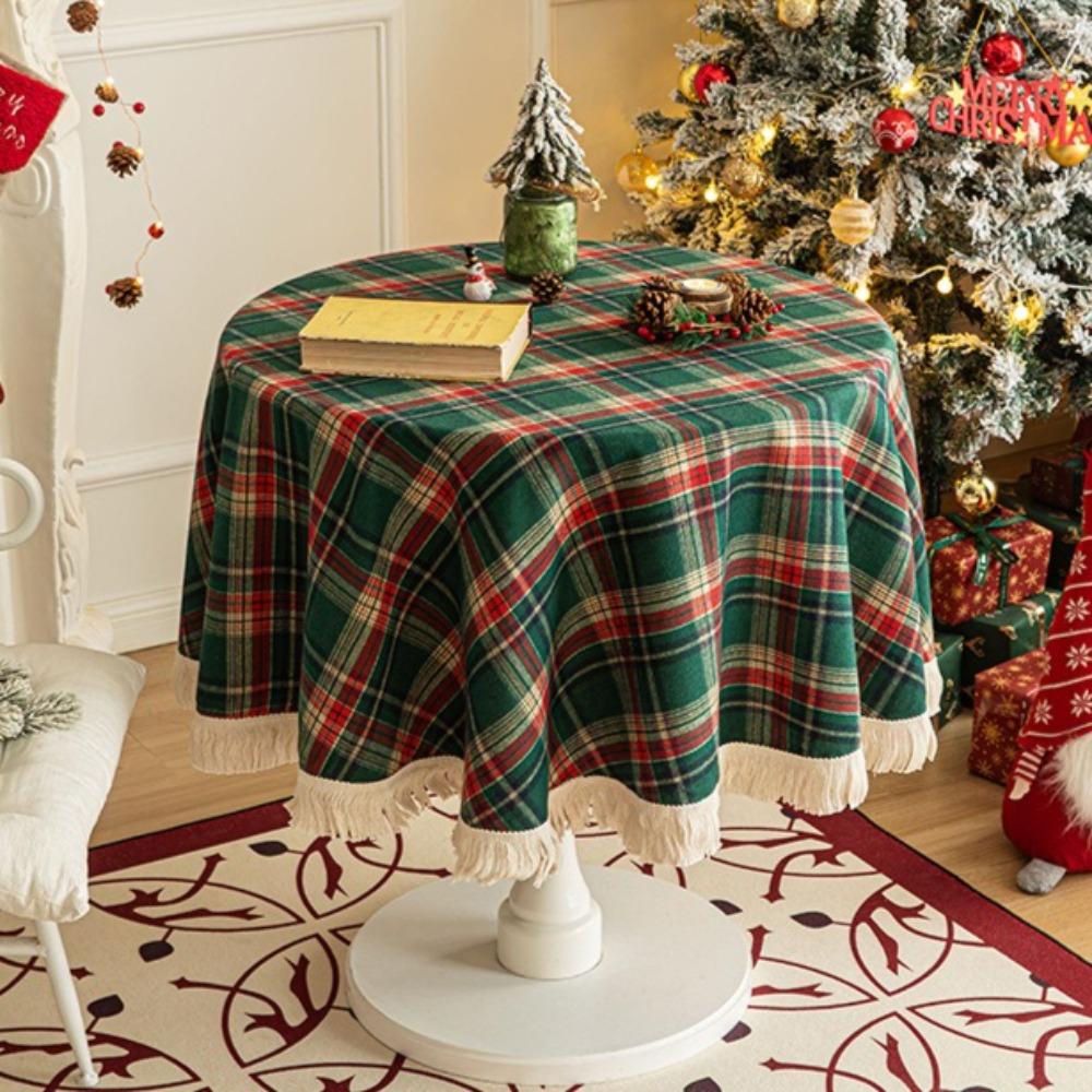 Christmas Plaid Round Tablecloth with Fringe Classic Red Green Checkered Retro Party Decor Dining Table Cover