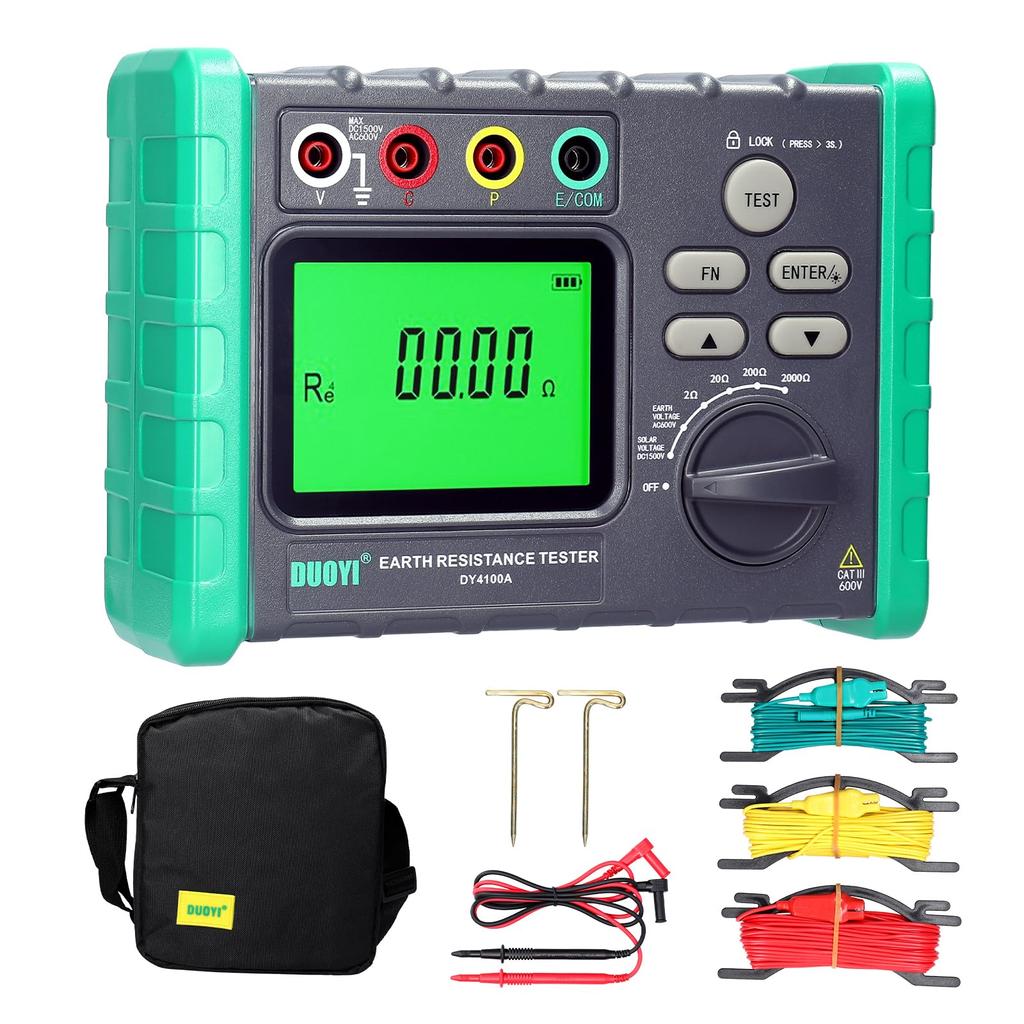 200Ω: 0.3×200.0Ω (0.1Ω resolution) 2000Ω: 3×2000Ω (1Ω resolution) Soil Resistivity Test Range (DY-4100B only) 2Ω: 0.2×376.8Ω.m 20Ω: 0.2×3768Ω 200Ω: 0.002×37.68Ω 2000Ω: 0.02×376.8Ω Ground Voltage Test Range: 0-600VAC Solar Power Voltage Test Range: -1500V~1500V Battery: 6 AA batteries (sold separately) Product Size: 173 * 125 * 68mm / 6.8 * 4.9 * 2.7inch Item Weight: 600g / 1.3lb Package Size: 215 * 135 * 250mm / 8.5 * 5.3 * 9.8inch Package Weight: 1850g / 4.1lb Package List: DY-4100A: 1 x Ground Resistance Tester, 1 x Storage Bag, 1 x User Manual, 2 x Test Cables, 2 x Ground Rods DY-4100B: 1 x Ground Resistance Tester