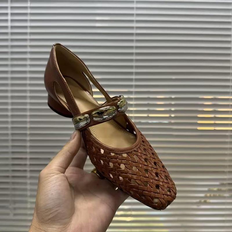 2025 Summer New Women's Cow Braided Microfiber Patchwork Mary Jane Round Low Heel Sweet Woven Single Shoes Sandal