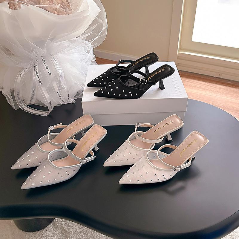 Grape mother summer new beautiful hot diamond temperament small pointed mesh yarn breathable 6cm thin heel empty sandals women