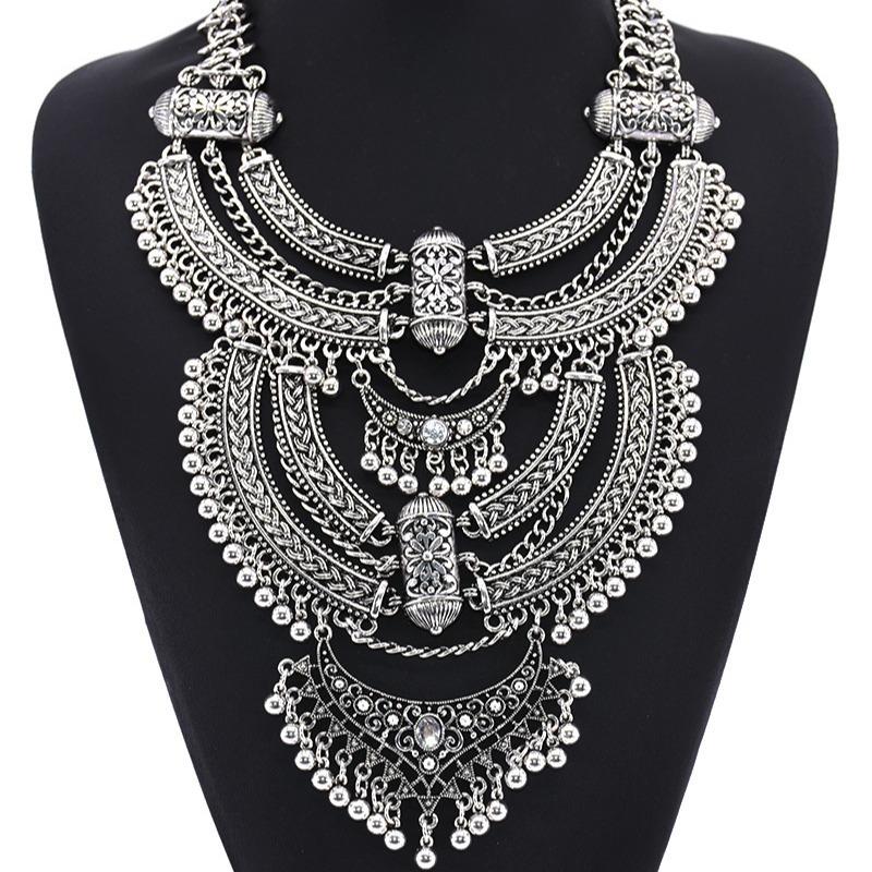 Exaggerated Retro Silver Engraved Pendant Necklace Collarbone Chain