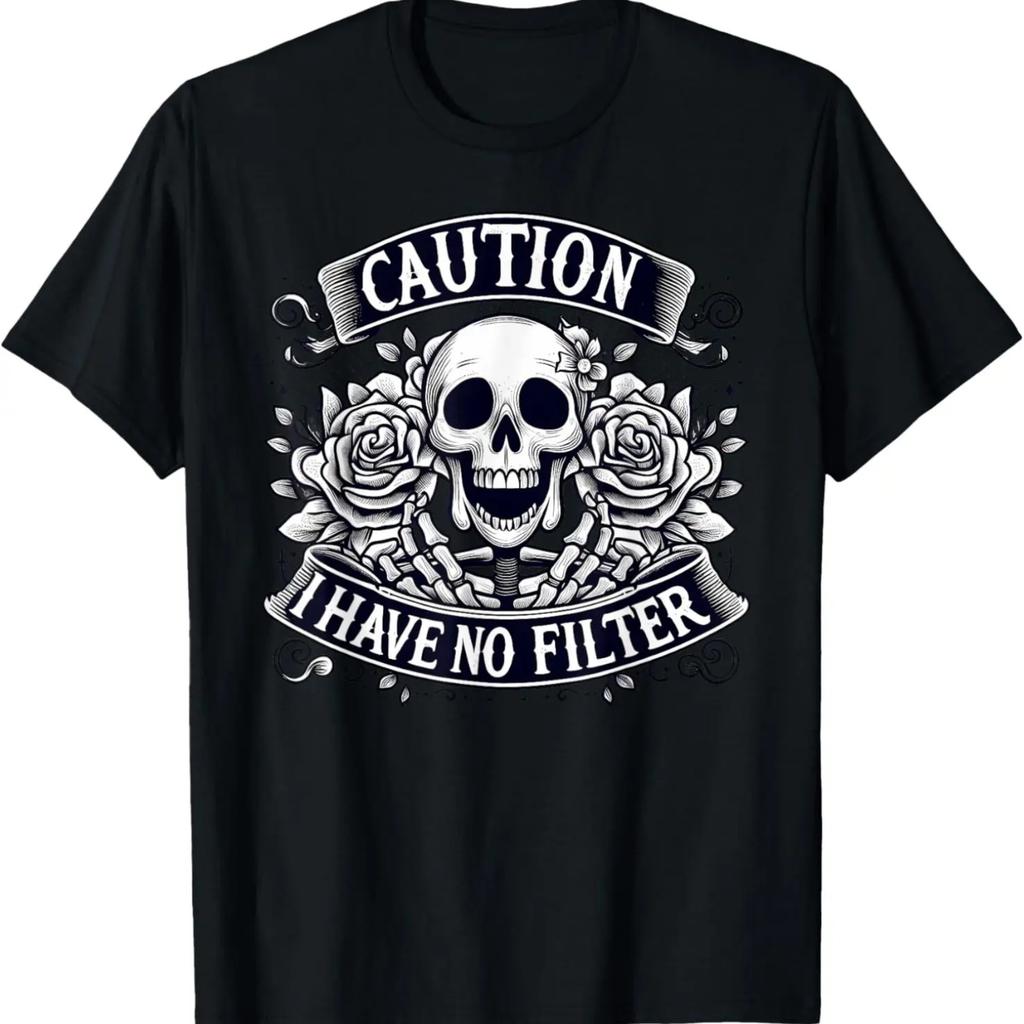 Funny Caution Comment Black And White Skull With Roses T-Shirt