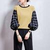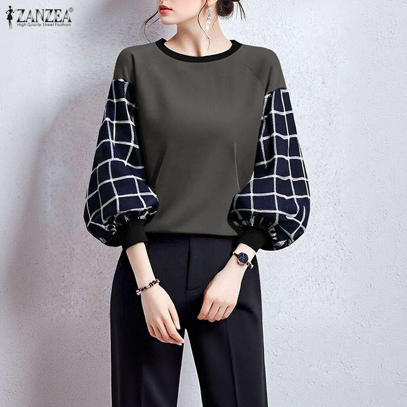 ZANZEA Bluză largă casual de damă cu gât rotund, mâneci bufante și imprimeu grilă îmbinat