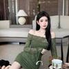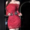 New one-word shoulder horn sleeve lace hollow dress women's slim waist temperament skirt hip skirt