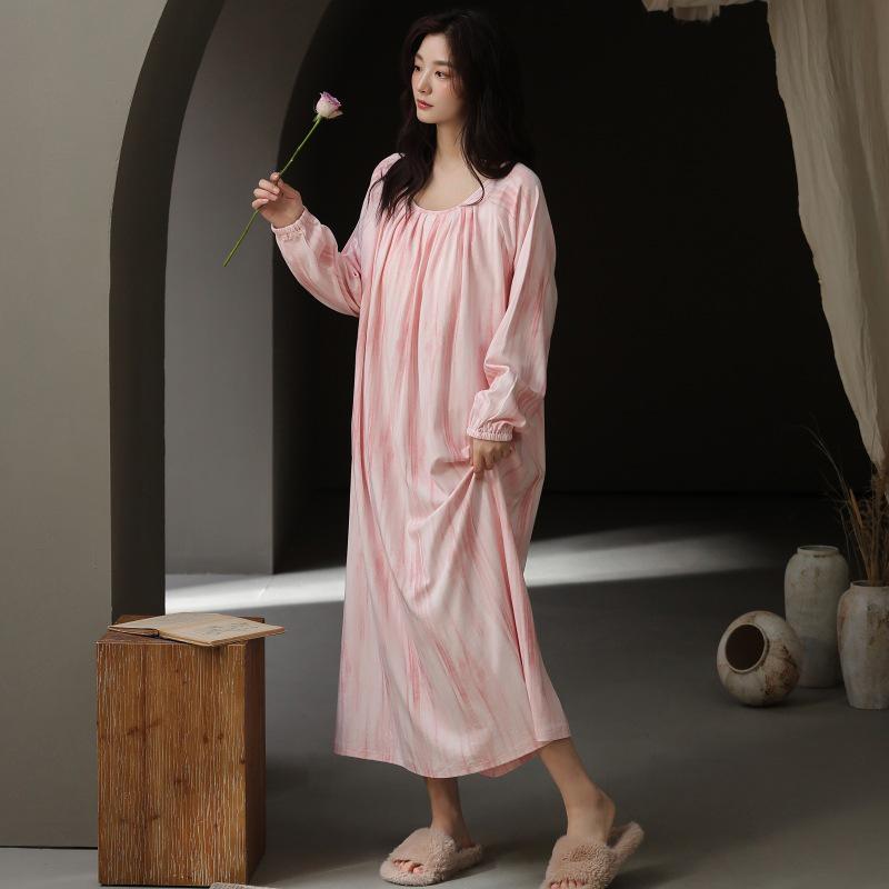 Cainiqing Autumn Women's Long-Sleeve Cotton Nightgown with Bra Pads - Maternity and Extended Length Dress for Home, Fall, and Spring.