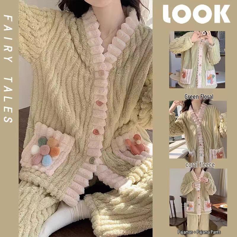 Set Pijama Coral Fleece de Toamnă/Iarnă pentru Femei - Halat de Baie Lung de Catifea și Cămașă de Noapte