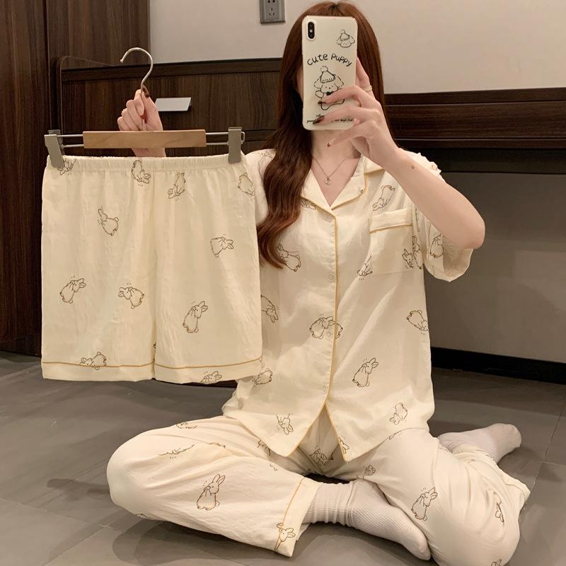 Experience ultimate comfort and style with this elegant three-piece pajama set, designed specifically for ladies who appreciate minimalist aesthetics. Featuring an adorable rabbit print, this set combines playful charm with sophisticated design. Crafted from plush cloud cotton, known for its softness, and durable polyester, it ensures a cozy and long-lasting wear. Perfect for lounging at home, this pajama set blends comfort and chic effortlessly, making it a must-have addition to your homewear collection.