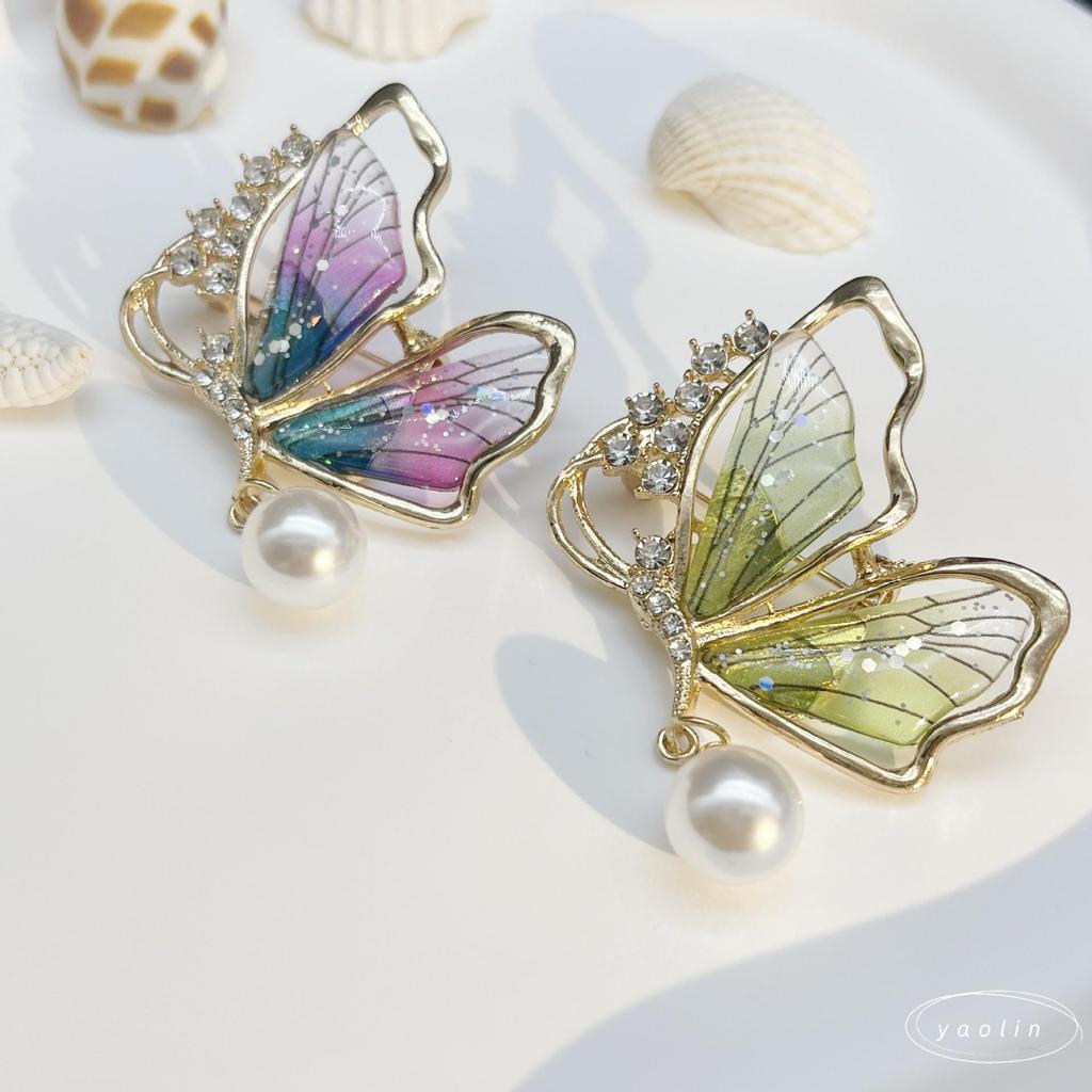 Light Luxury Rhinestone Butterfly Pearl Brooch – Hollow Design with Insect Button
