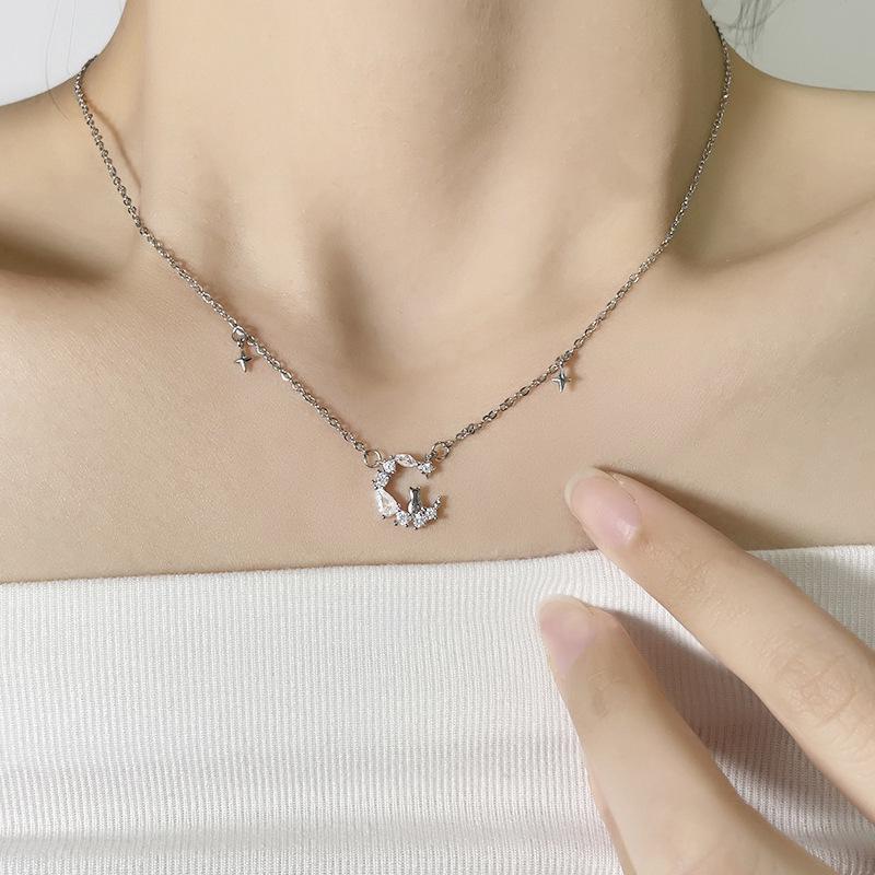 Sterling Silver Moon Cat Necklace: Cute Star and Moon Pendant for Women
