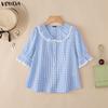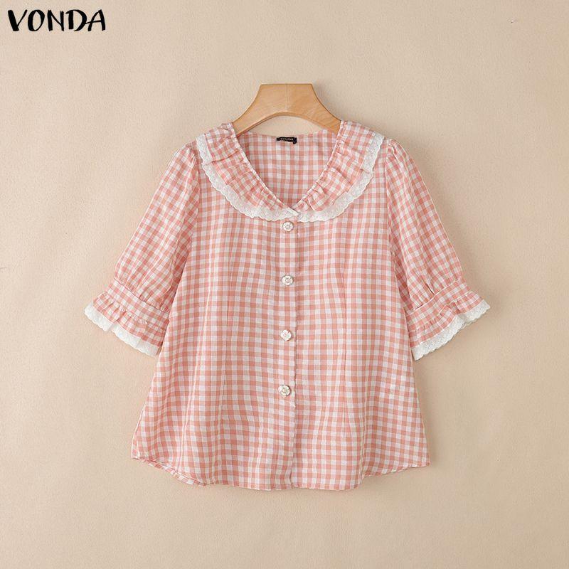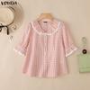 VONDA Topuri casual pentru femei, cu guler rever, mânecă scurtă, cusătură, imprimeu carouri