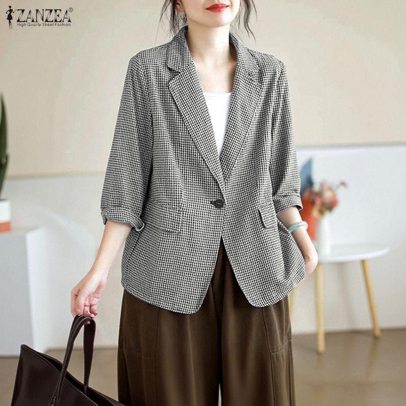 ZANZEA Women Casual Turn Down Collar Long Sleeve Plaid Print Thin Cardigan Blazer