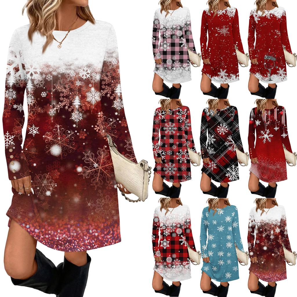 Women's Fashion Casual Dress With Pockets, Decorative Buttons, Christmas Prints, Round Neck And Long Sleeves
