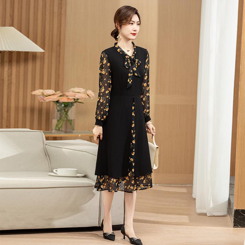Experience timeless elegance with this beautifully designed midi dress, crafted specifically for middle-aged women seeking stylish comfort. Featuring a sophisticated floral pattern, this dress showcases a graceful ruffle collar and long sleeves, perfect for the transitional seasons of spring and autumn. Designed to create a flattering, layered look, the fake two-piece design adds a touch of modernity to the classic silhouette. Made from high-quality chiffon material, this dress promises both breathability and grace, ensuring you look and feel your best on any occasion. Plus size options are available to offer a perfect fit for everyone.